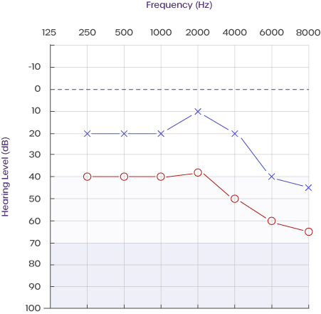 - 将听力较差耳的音调从原始阈值减少10 dB。例如:在500 Hz时,右耳的音调将降低至60 dB。